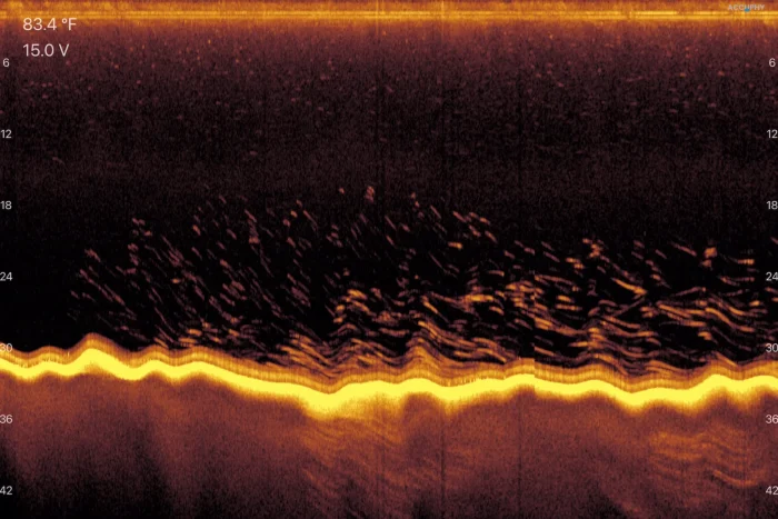 Chirp szonár mód, a mederalakulatok, tereptárgyak, halak elkülönítésrére.